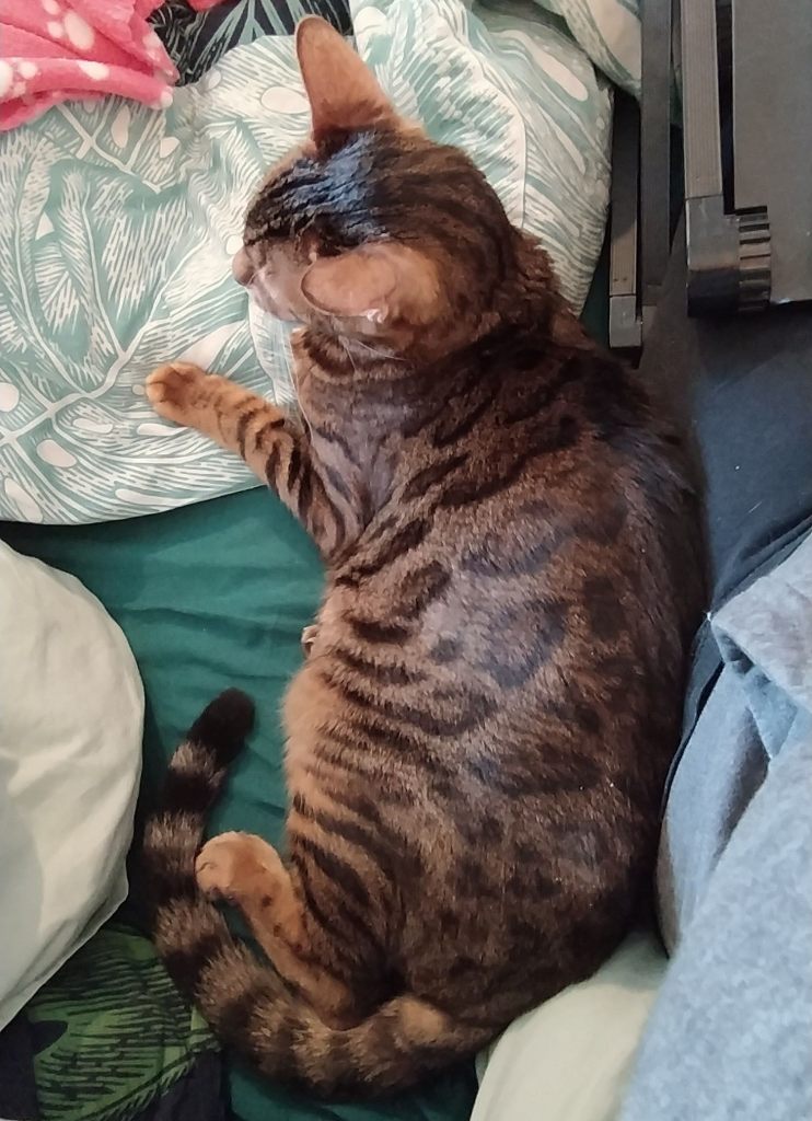 La semaine d’Hélium s’est globalement bien passée. Il fait de gros progrès côté santé et une visite chez la véto l’a confirmé (son poids se maintient autour de 4kg). Mais il m’a aussi fait une journée avec quelques vomis. Avec le recul, je pense qu’il fait de temps en temps (tous les 10 jours environ?) une petite crise où il vide son estomac, il n’est pas bien quelques heures et le soir tout revient à la normale. Je suppose que c’est sa tumeur la responsable. Comme l’a dit ma véto, il n’a pas un diabète classique à cause d’elle. Mais nous n’allons pas baisser les bras! Je sais qu’il n’y a pas de chances de guérison et que l’issue est fatale mais tant qu’Hélium veut se battre, je l’aide du mieux que je peux.